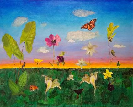found images, watercolor, colored pencil on canvas, 32” x 40”